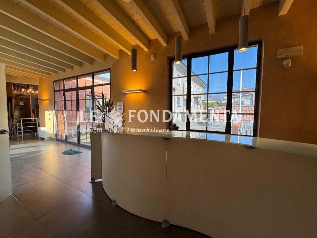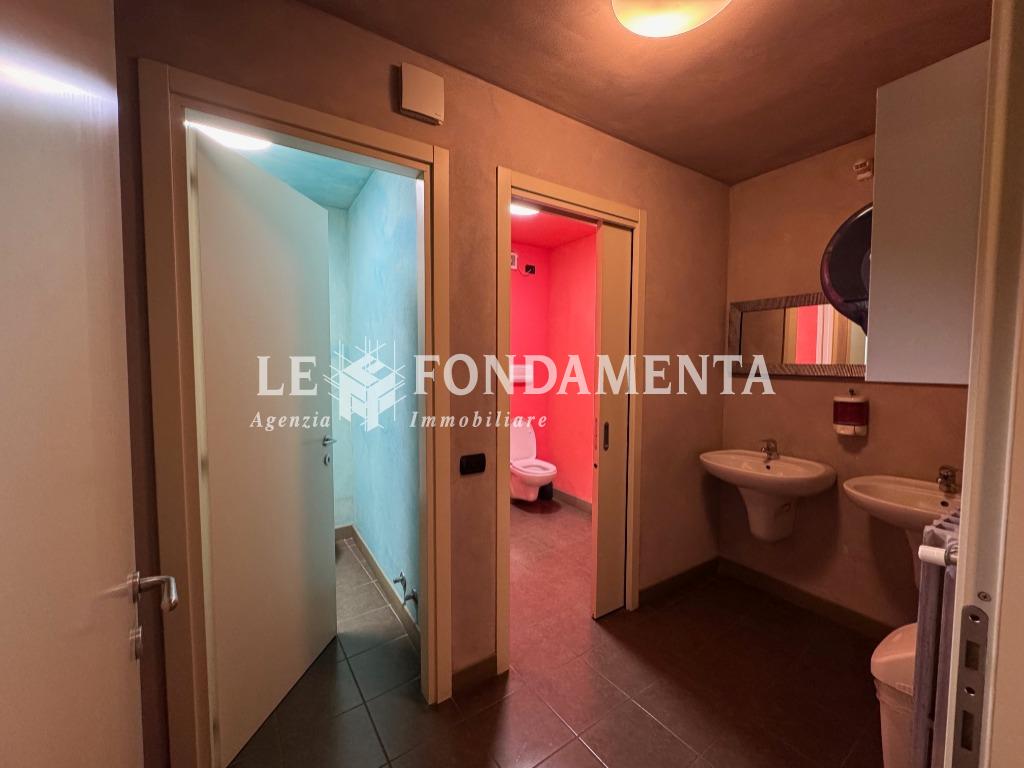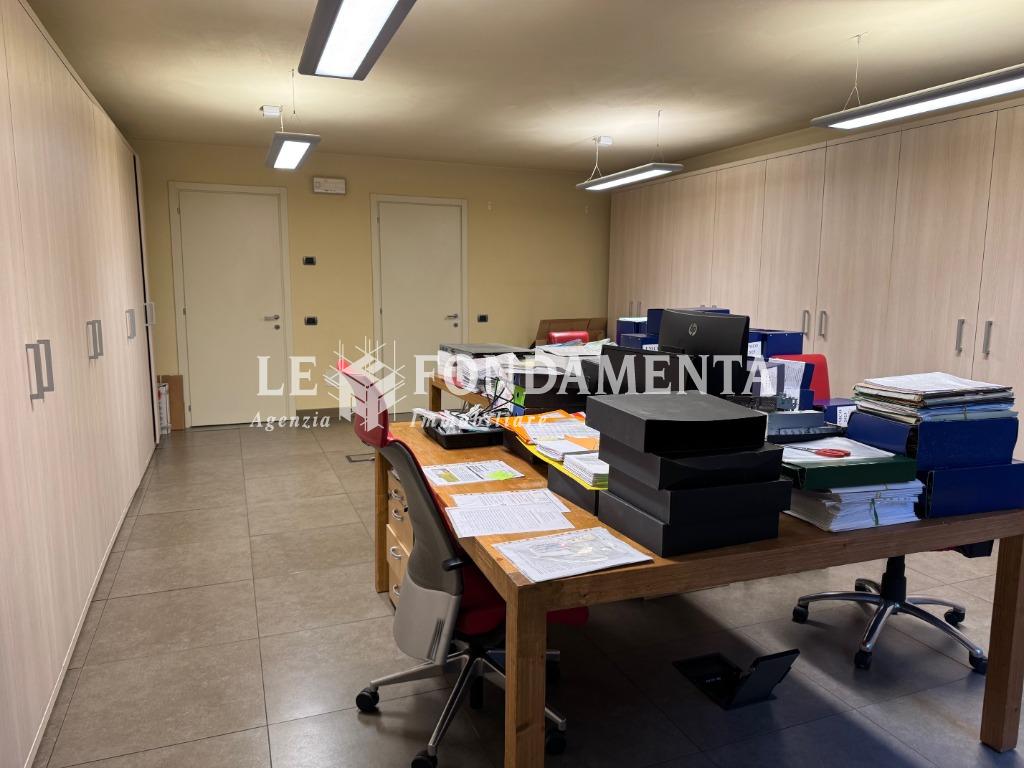 La disposizione interna è la seguente: al piano terra (mq 180) troviamo l'ampio ingresso con reception, sala attesa e n. 7 uffici; al piano interrato (mq 100) servito da elevatore abbiamo una spaziosa sala riunioni, caratteristico cavedio, doppi servizi, un locale ristoro dipendenti, due stanze ad uso archivio e ben 2 autorimesse doppie che hanno accesso dal monta-auto presente nel cortile.