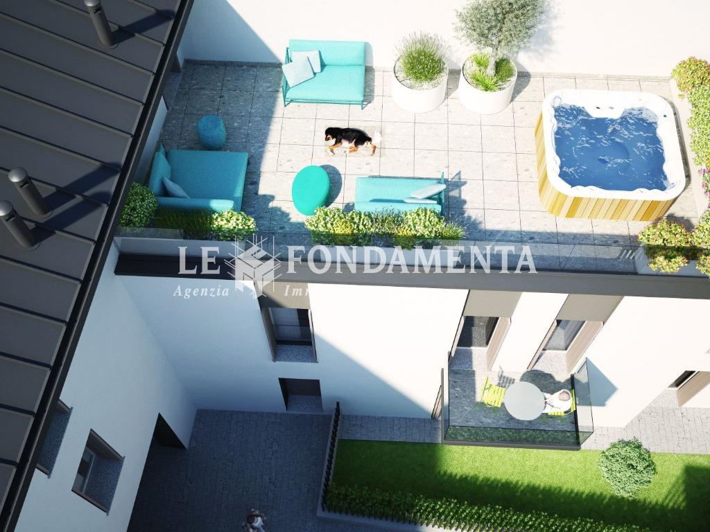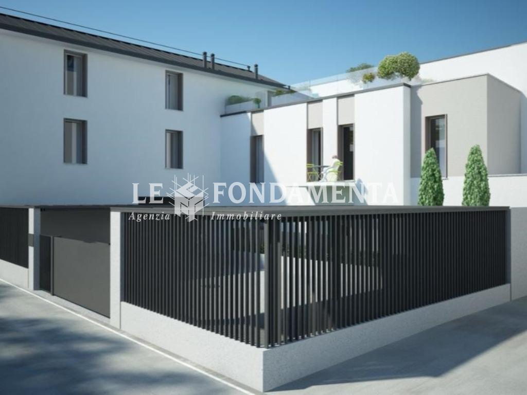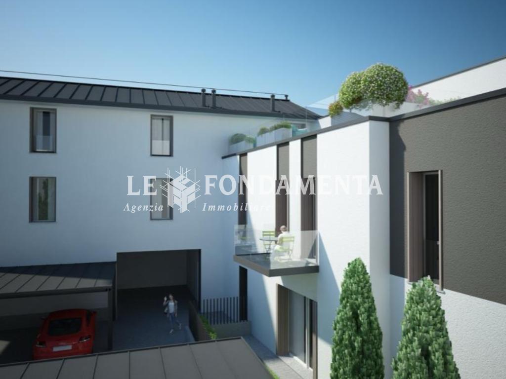 In palazzina in fase di realizzazione, composta da sole 3 unità immobiliari, in posizione centrale a due passi da Piazza Duomo, proponiamo soluzione indipendente con giardinetto esclusivo, composta da 4 locali con doppi servizi, luminosa e funzionale. Il taglio proposto prevede un atrio d'ingresso, soggiorno con cucina abitabile a vista e accesso al giardino, disimpegno e bagno al piano terra; dalla scala interna si accede al primo piano dove troviamo le 3 camere da letto, il secondo bagno e un terrazzino.