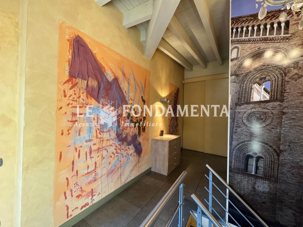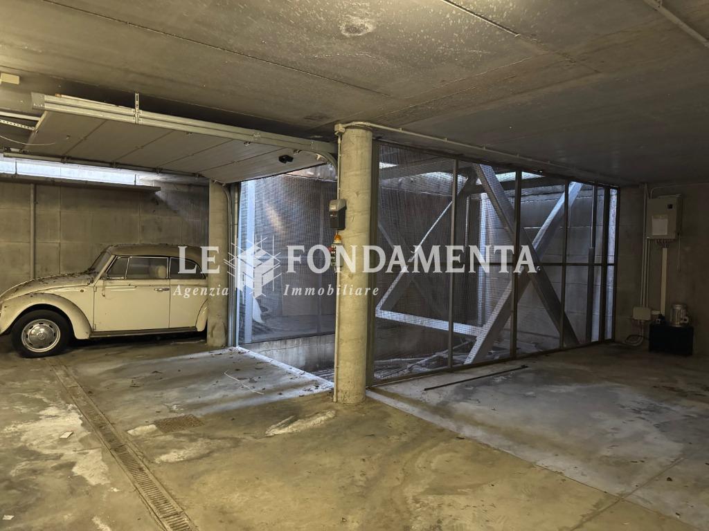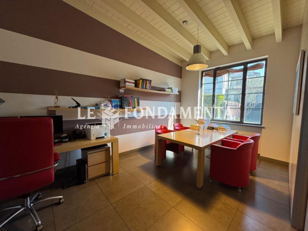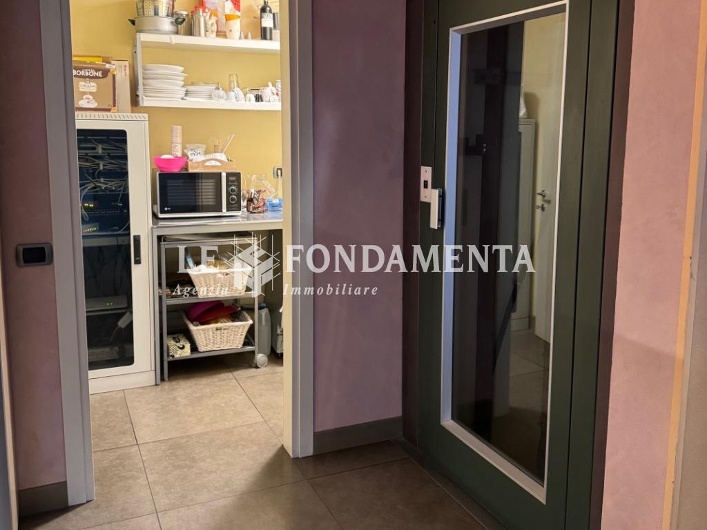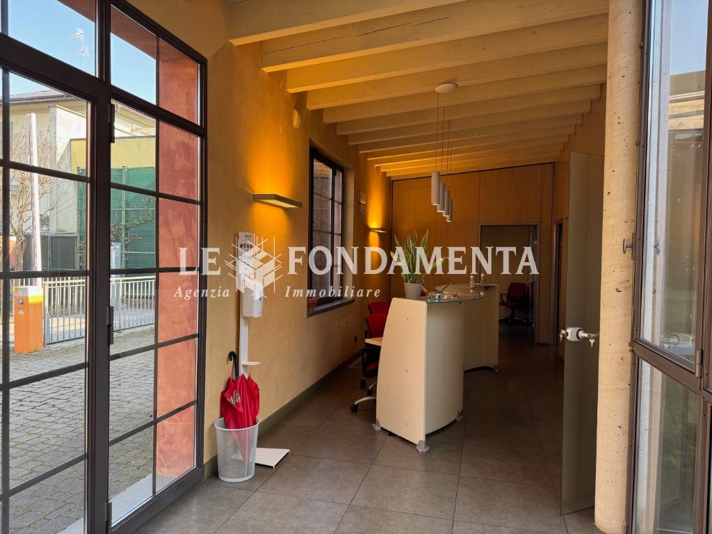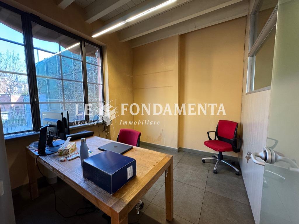 La disposizione interna è la seguente: al piano terra (mq 180) troviamo l'ampio ingresso con reception, sala attesa e n. 7 uffici; al piano interrato (mq 100) servito da elevatore abbiamo una spaziosa sala riunioni, caratteristico cavedio, doppi servizi, un locale ristoro dipendenti, due stanze ad uso archivio e ben 2 autorimesse doppie che hanno accesso dal monta-auto presente nel cortile.
